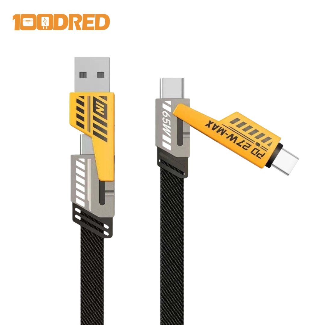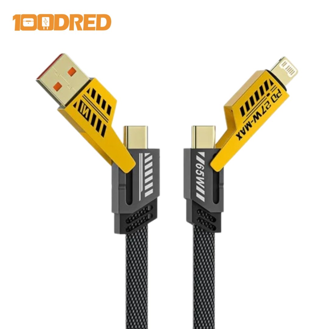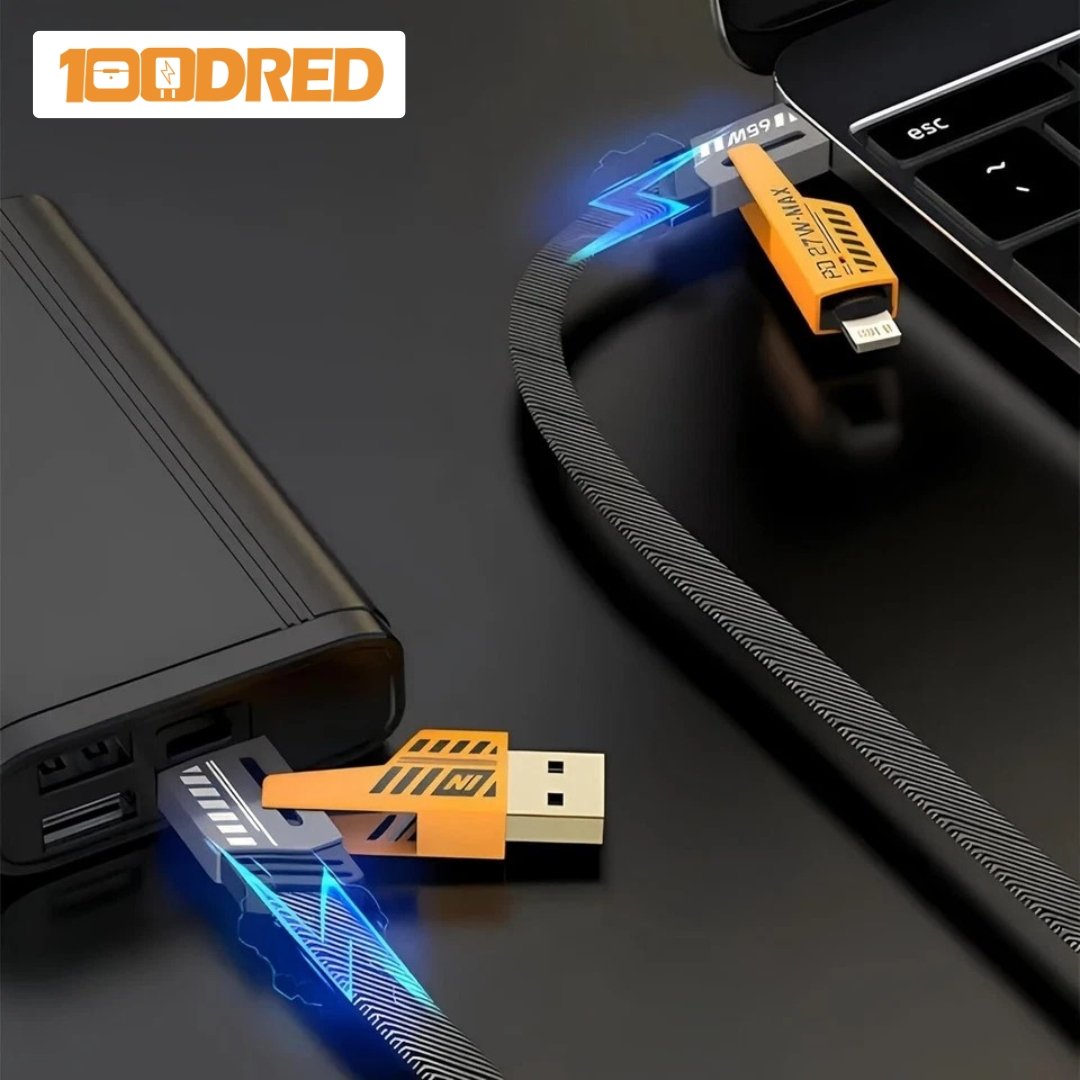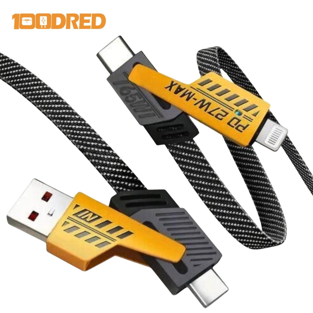 Inspired by Mecha design aesthetics, this cable blends strength with sleek style. Its metallic finish and smart LED indicators add a touch of tech sophistication to your setup. Whether you’re at home, at work, or on the go, the 100dred 4-in-1 Mecha Cable keeps you powered — fast, safe, and in style.